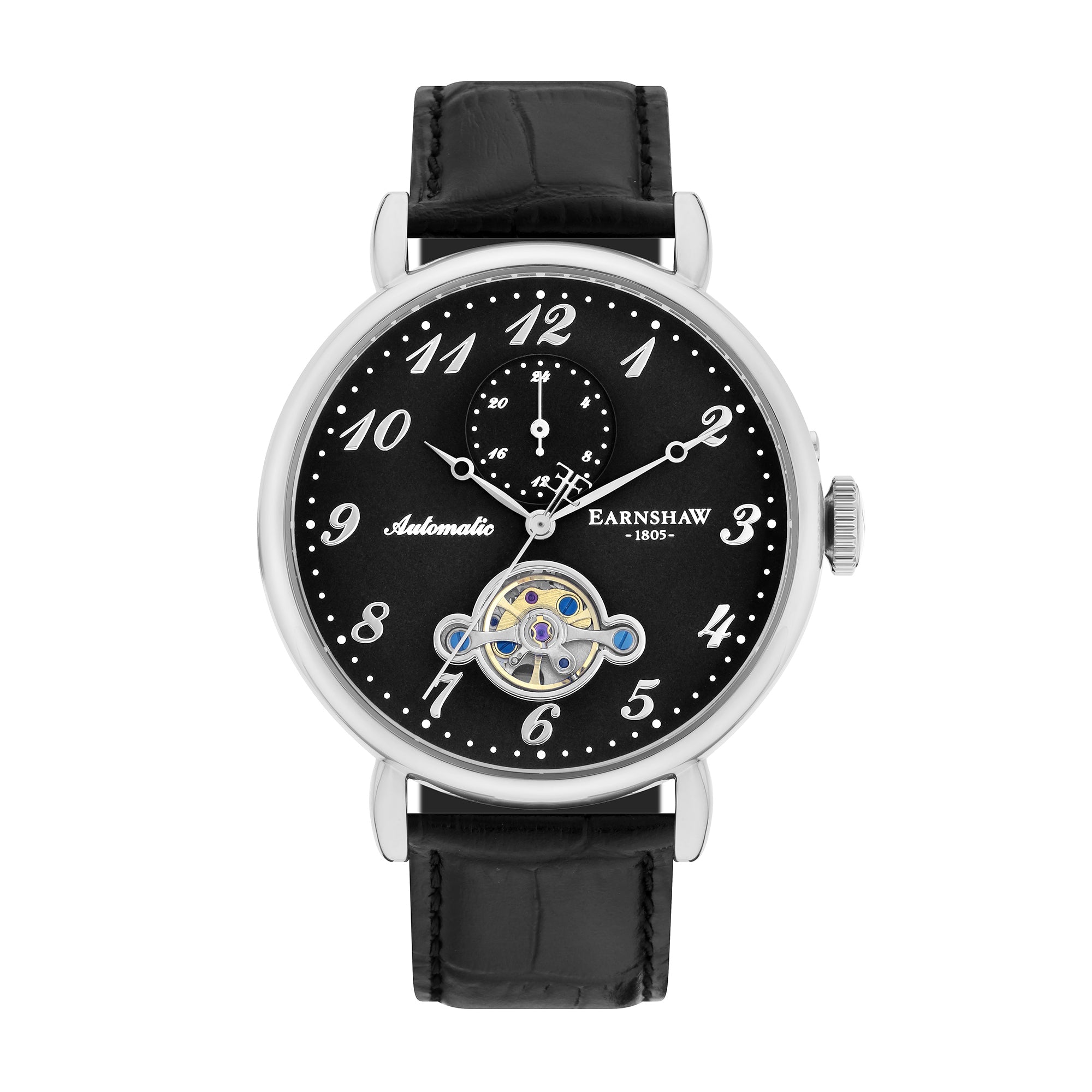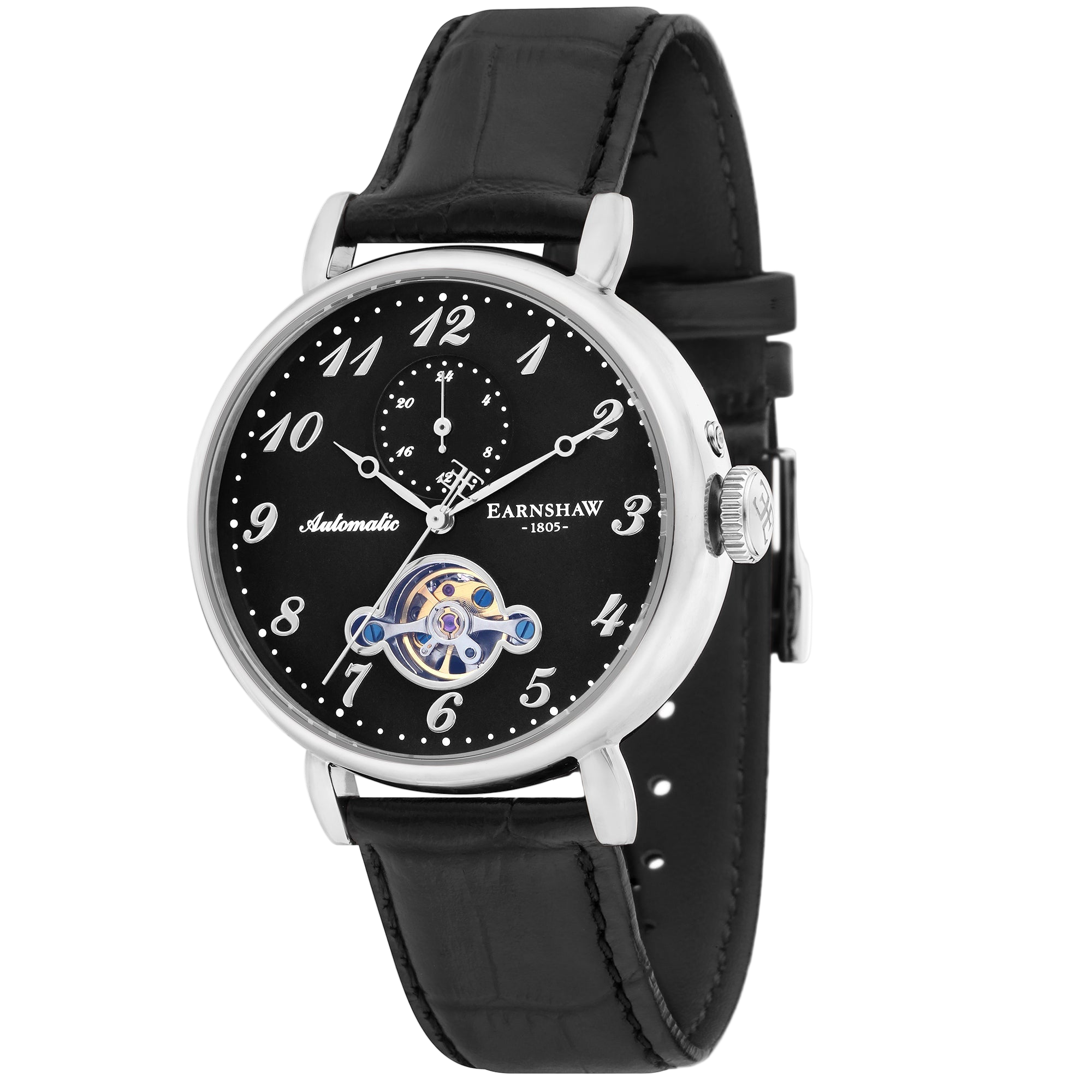 Exuding timeless elegance and refined craftsmanship, this 42mm automatic timepiece captivates with its open-heart dial design, offering a mesmerizing view into the intricate workings within. A 24-hour indicator adds functional sophistication. This watch is not just a tribute to horological artistry—it's a bold statement of style and precision for the modern gentleman.
