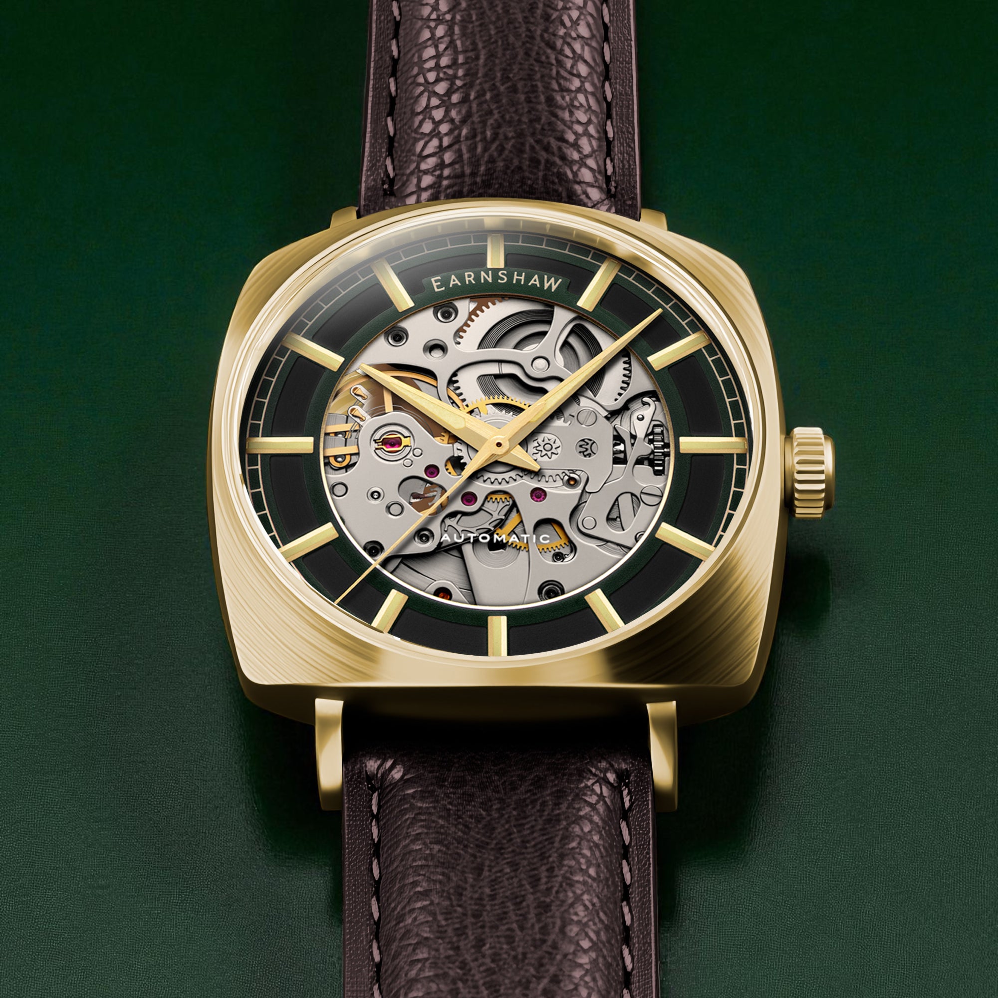 Its polished 40mm square case draws attention with sleek boldness. The skeleton dial reveals the intricate automatic movement within. Paired with an exhibition caseback, the Moorgate invites you to experience the artistry of time.