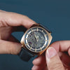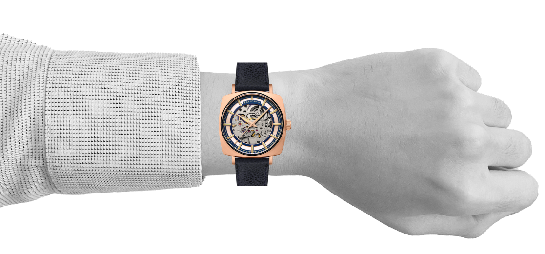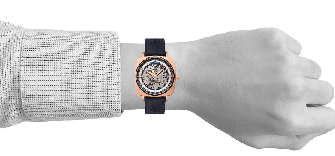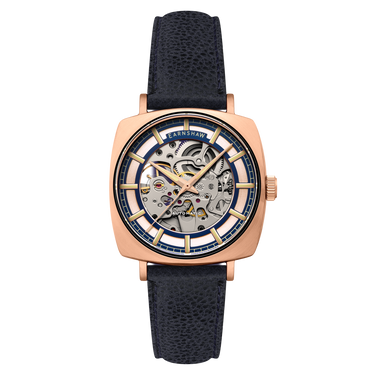 Its polished 40mm square case draws attention with sleek boldness. The skeleton dial reveals the intricate automatic movement within. Paired with an exhibition caseback, the Moorgate invites you to experience the artistry of time.
