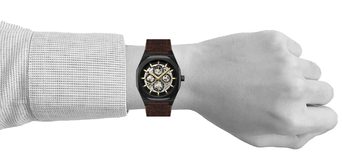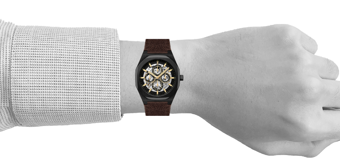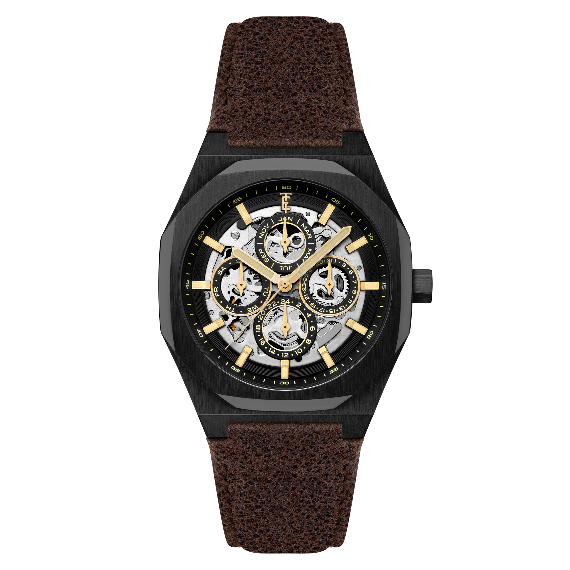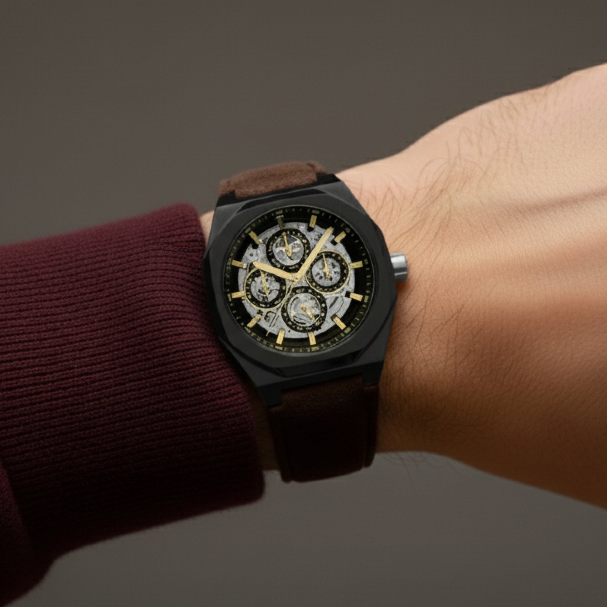 The Drake returns, now reimagined with enhanced complications. At its core, the automatic movement offers a clear display of time, day, date, and month—all at a glance. The skeletonized dial unveils the mechanical artistry within, showcasing the captivating rhythm of its inner workings. Encased in a 42mm polished stainless steel case, the Drake is designed to complement your journeys ahead.