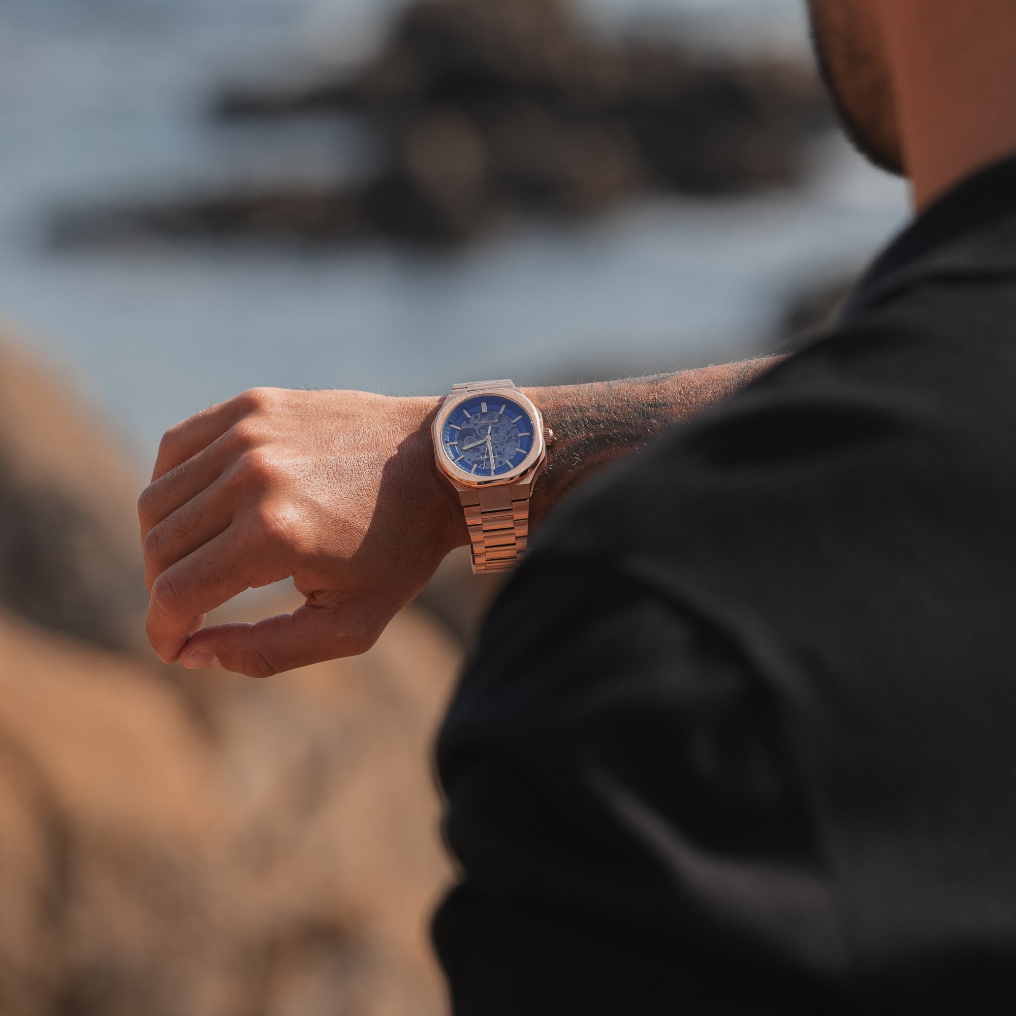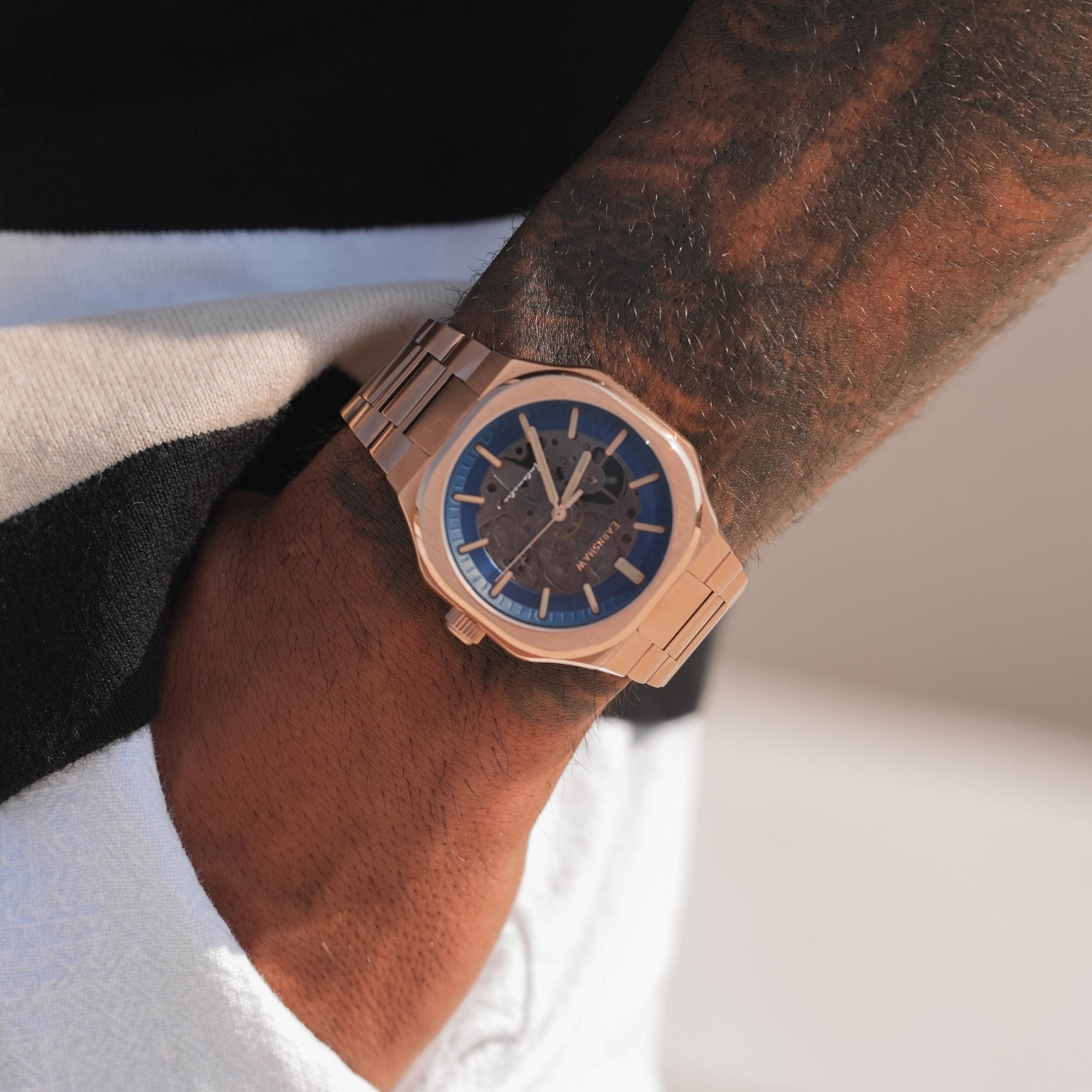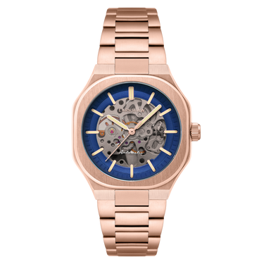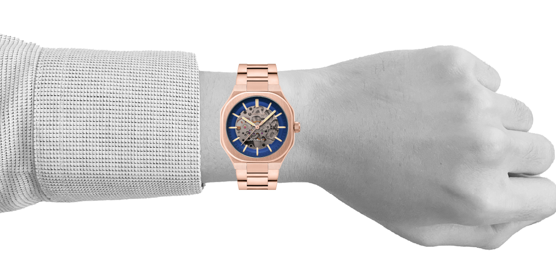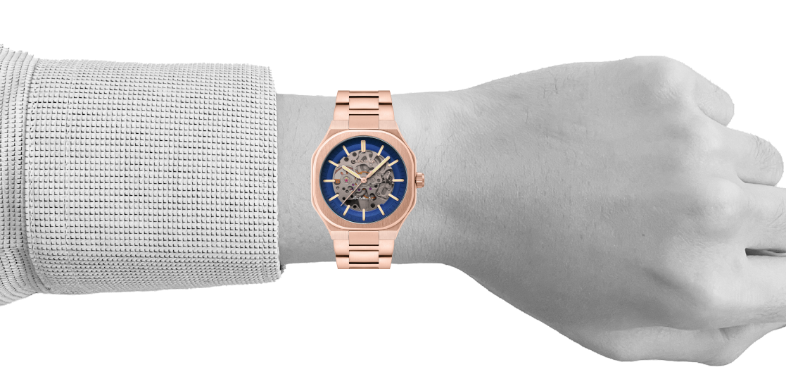 Encased within a bold 42mm stainless steel frame, the Exeter’s signature hexagonal silhouette makes a refined yet daring departure from convention, evoking the pioneering spirit of discovery. With a fully skeletonized dial and an exhibition caseback, it is a fusion of architectural precision and horological sophistication.