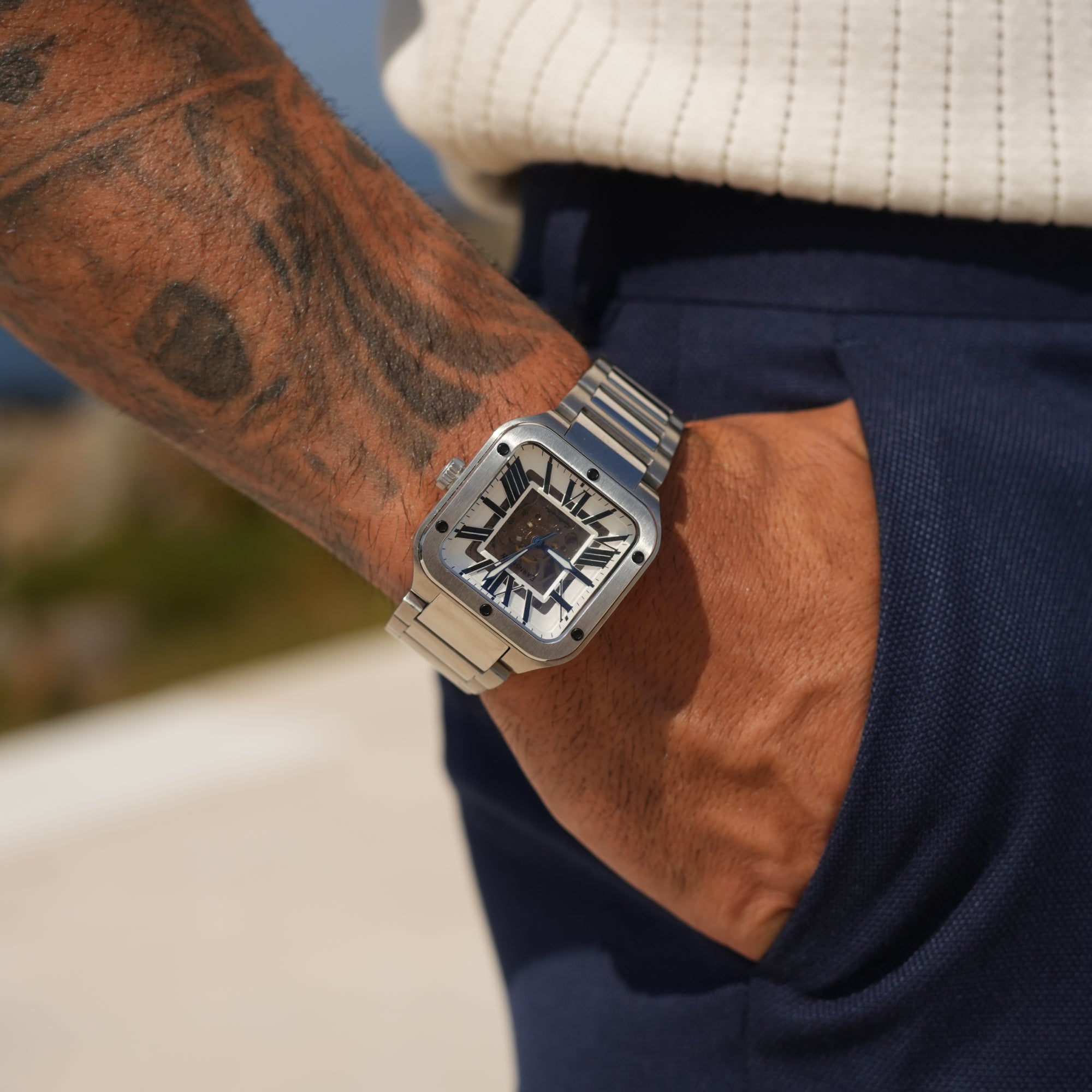 Encased in a compact square silhouette at 36.5mm, the Lennox reveals the intricate mechanics of its automatic skeleton movement. Finished with a stainless steel bracelet and butterfly clasp, this square-cased skeleton watch balances precision with personality.