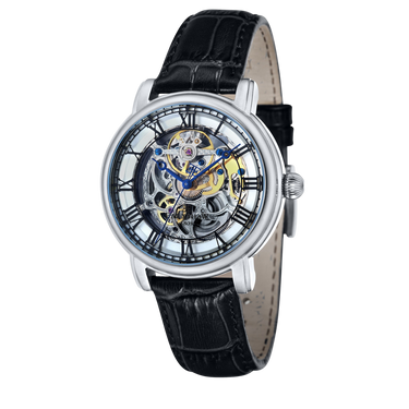 In the spirit of clock-making, utter precision and care form the backbone of the Longcase collection. Handcrafted individually, using hundreds of pieces to come together in perfect mechanical congruency. Each piece is a three-hand automatic skeleton. The face is a delightful aesthetic indulgence as the exposed mechanics not only reveal the intricate workings of the Longcase but are beautifully decorated with gems that are laid in minute studs and tiny coloured screws which adds a lavish dimension to the watch.