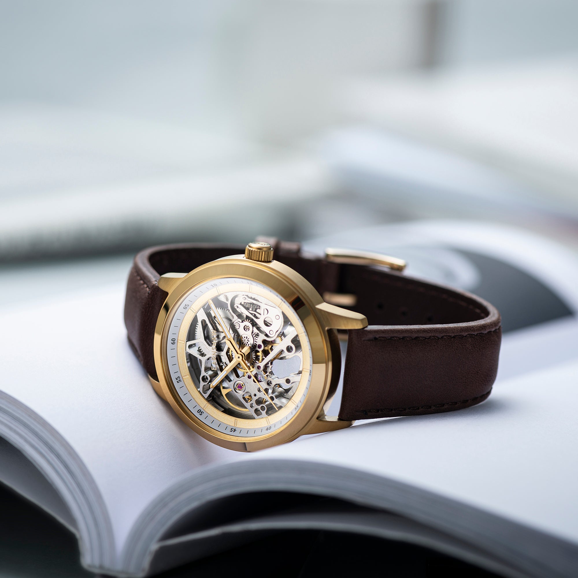 A clean, modern, mechanical watch with a beautiful skeletonised automatic movement, the intricacy and skill of watchmaking that went into this timepiece is evident in its design.