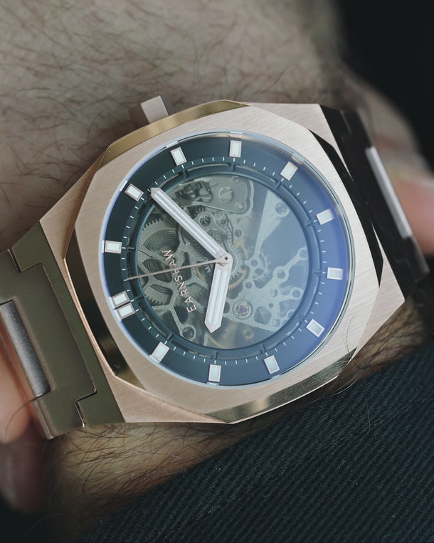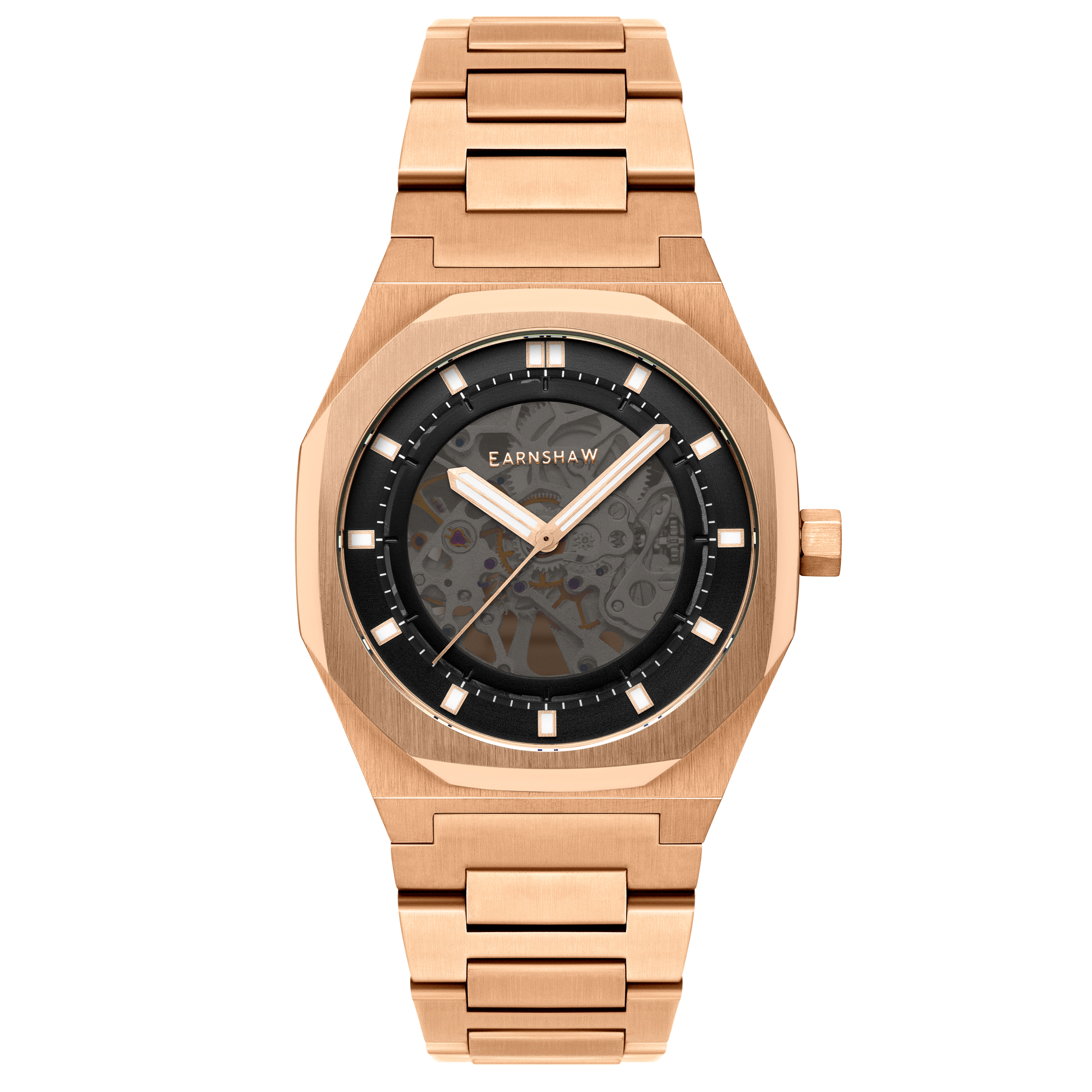 Stylish and sophisticated, the Drake displays the inner workings of its self-powered, skeleton Automatic movement through the dial. A full expression of centuries of watchmaking.