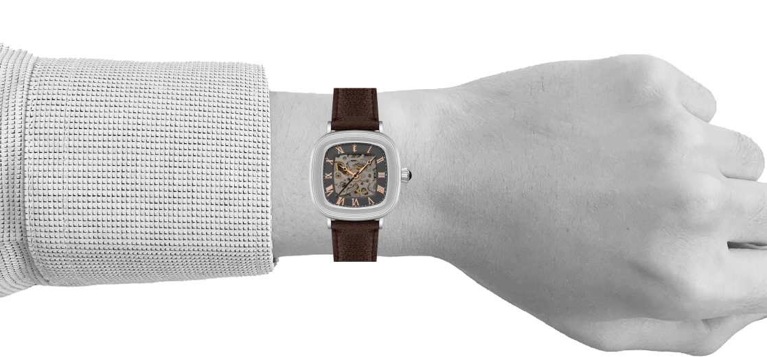 With its compact 38mm square case, the Chester is designed for balance. The timepiece also reveals its mechanical heartbeat with its skeleton dial and see-through exhibition caseback. Effortlessly refined for both everyday wear and formal elegance, the Chester brings sophistication and character together in one clean, square form.