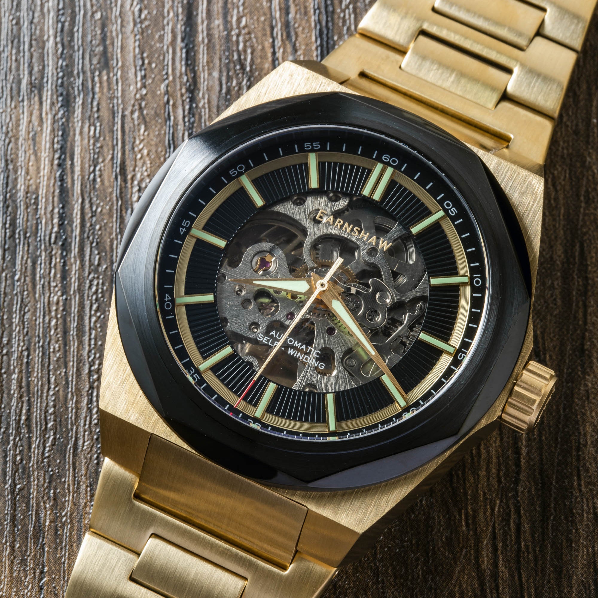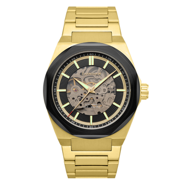 Durable, yet luxurious, this watch is a modern cleanly built sports watch handbuilt and powered by the battery-free mechanics of the skeleton automatic movement visible through the dial